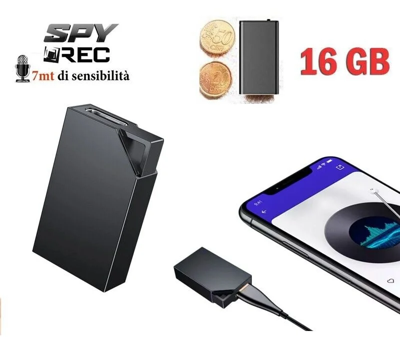 Microspia audio con 2 microfoni panoramici e batteria da 2000 mAh. Offre fino a 10 ore di ascolto continuo e 7 giorni di standby. Ricarica rapida in 90 minuti, ideale per auto e ambienti interni