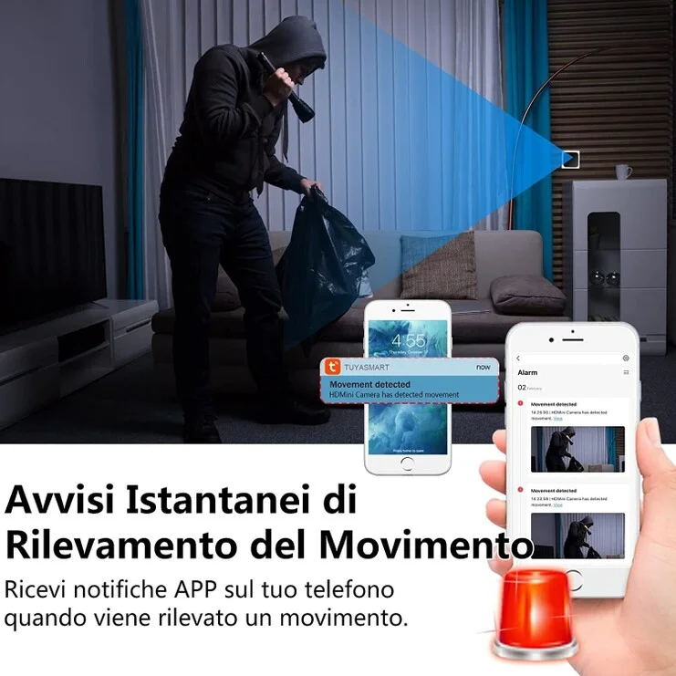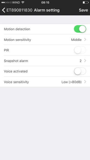 Se attivata il dispositivo quando rileva un movimento effettua due operazione, la prima e' quella che inizia la registrazione su sd card, e la seconda è che vi invia un allarme direttamente sul vostro telefono, tablet, informandovi che un movimento è in atto e quindi vi invita a collegarvi in diretta. E' inoltre possibile scegliere la sensibilità del sensore di movimento, questa esclusiva funzione vi permette di impostare la sensibilità soprattutto in base agli ambienti in cui la microcamera viene installata. Quindi in condizioni di luminosita' scarsa sara' necessario selezionare la modalita' HIGHT, sensibile.