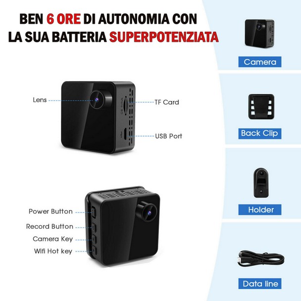 Con una singola batteria avrete ben 6/7 ore consecutive di registrazione un record assoluto, se tutte le altre microcamere wifi si scaricano solo dopo un ora di trasmissione con questa versione supererete le 6 ore consecutive!
