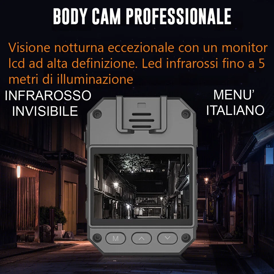 Ampio display e lingua italianaGrazie al display in dotazione la body cam è regolabile in ogni sua funzionalità in modo molto semplice, il menù in lingua italiana permette di comprendere a fondo ogni singola funzionalità della telecamera che può registrare in modo continuo all' accensione oppure accendersi ed avviare la registrazione audio e video solo quando vi è del movimento di fronte