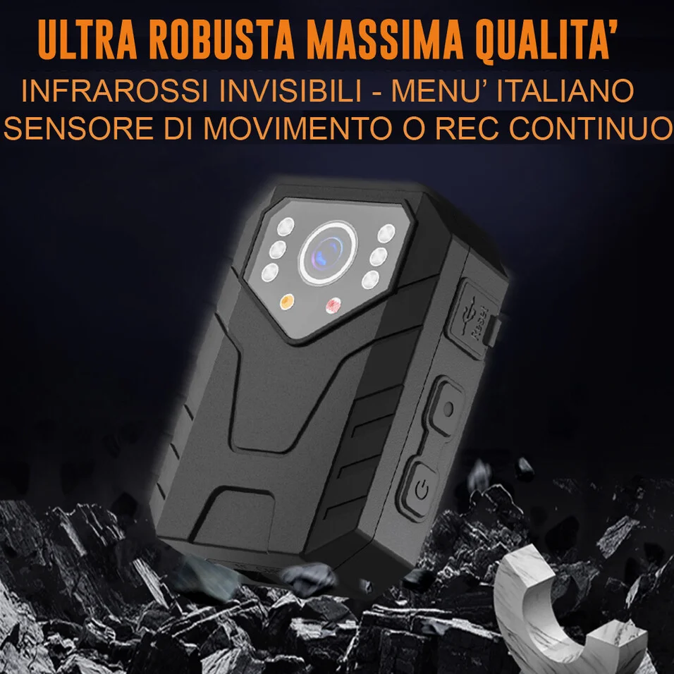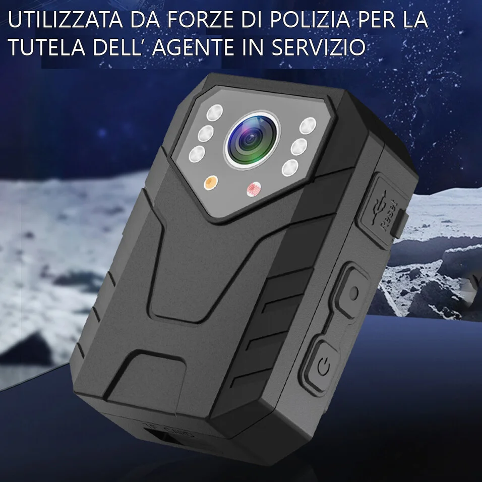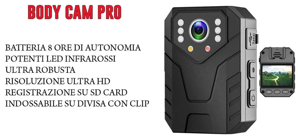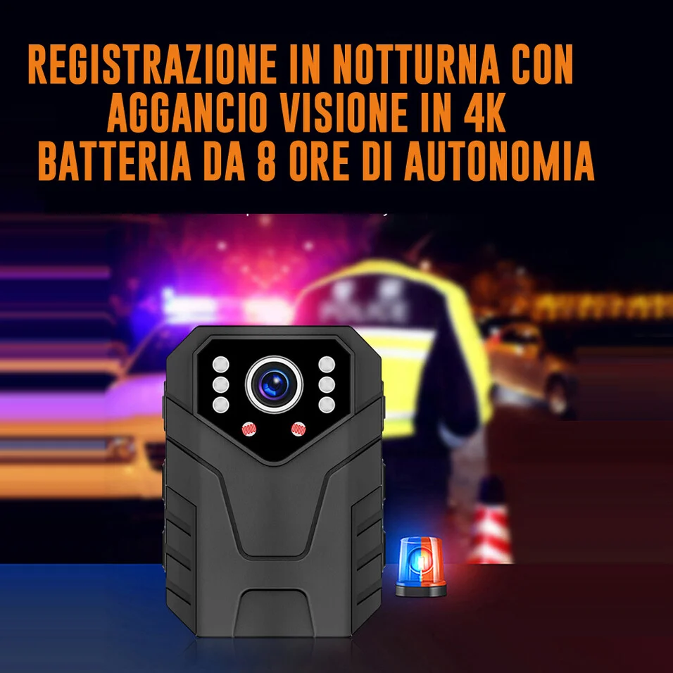 Bodycam professionale, una telecamera a led infrarossi potentissima indossabile grazie al gancio posteriore, una telecamera dotata di ampio display posto sul retro. Permette di effettuare delle registrazioni con una qualità di immagine in realein 4k, e led infrarossi potentissimi che offrono un illuminazione di circa 6mt. Funzione di registrazione automatica su micro sd, fino a 128gb, una telecamera indossabile indicata per proteggere la propria persona da aggressioni, quindi un oggetto indicato ed utilizzato da anni dalle forza di polizia e sicurezza stradale.