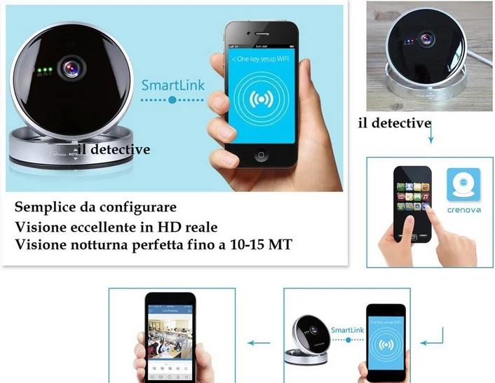 su comando direttamente dal vostro smartphone android o apple, oppure in automatico grazie al sensore di movimento integrato. La telecamera si connette alla linea adsl di un qualsiasi luogo e tramite la connessione internet riesce a inviarvi in diretta audio video immagini in hd con risoluzione 1280*720p con immagini nitide e colori brillanti. La telecamera è rotante ( non motorizzata ) e permette di posizionarla nell' ambiente nella maniera migliore possibile affinche' possa riprendere tutto l' ambiente, posizionandola anche in alto. Questa versione è adatta per uso in appartamento o ufficio visto il suo elegante aspetto estetico, curata in ogni minimo particolare questa fantastica telecamera ip dona immagini di qualità eccezionale, colori vivaci di giorno e visione perfetta di notte, un tocco di classe per le telecamere a trasmissione video.