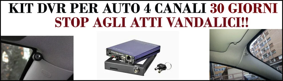Micro dvr 4 canali Il dvr incluso nel kit, di dimensioni ultraridotte ha una compressione video H.2.6.4. permette l' installazione delle 4 telecamere, a richiesta è possibile aggiungere ulteriori canali ad esempio per mezzi più grandi quali camion e barche... Inoltre il dvr è dotato di un uscita wifi, in caso di mezzo parcheggiato in una zona vicino casa, nel raggio di 30-40 mt, è possibile installare un antennino wifi, per poter visionare in diretta le immagini. Il kit di registrazione viene modificato e reso di dimensioni ultraridotte affinchè possa essere nascosto in maniera ottimale. Le dimensioni sono ridotte in maniera tale da occupare pochissimo spazio dell' auto, ad esempio può essere collogato comodamente sotto il tappetino vicino alla ruota di scorta.