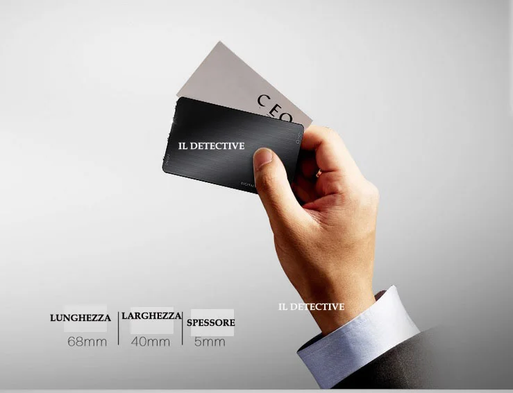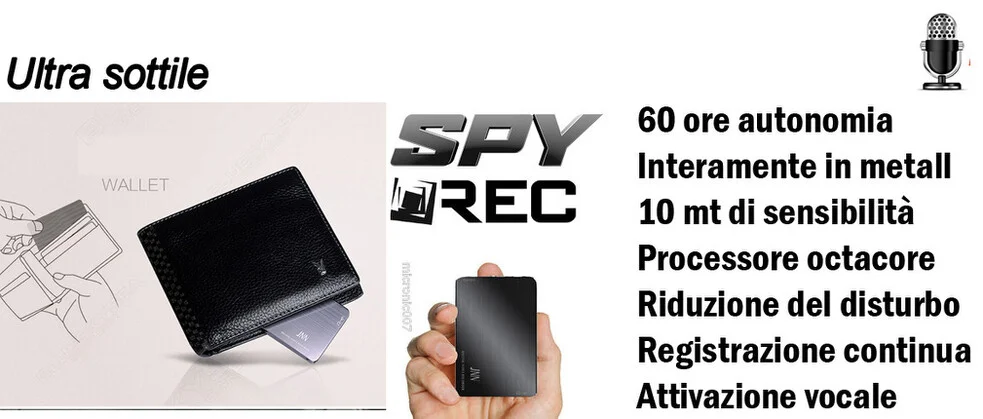 Questa versione offre registrazioni di qualità eccezionale, superiore a qualsiasi altro mini registratore, il microfono interno ultra sensibile capta rumori entro 10 mt di un ambiente. La qualità costruttiva è assolutamente fantastica intermante in metallo, con uno spessore di soli 0,5 mm, il mini registratore e' appositamente creato con queste caratteristiche estetiche ultraslim per facilitarne l occultamento in giacche, marsupi, borse, in maniera tale da non poter essere visto, e' ovvio che bisogna trovare il posizionamento giusto non con stoffe troppo spesse altrimenti la qualita' auto potrebbe risentirne, quindi stoffe piuttosto leggere.