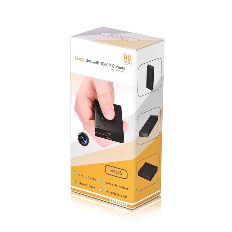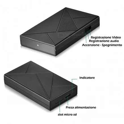 Una piccolissima telecamera, per lo più conosciute come " black box" piccole scatole nere che offrono un sistema di videoregistrazione discreto. Il dispositivo si occulta facilmente trattandosi di una microcamera di pochi centimetri. La telecamera posta sul fronte è dotata di led infrarossi invisibili ed automatici, che si attivano ogni qualvolta ce ne sia bisogno. Registra su micro sd, offre la possibilità di inserire memorie sd fino ad un massimo di 32gb, la batteria è ricaricabile e nonostante le dimensioni ridotte dell' oggetto offre ben oltre 4 ore di autonomia un record assoluto per le telecamere di tali dimensioni. Registra su movimento oppure su registrazione continua, il tutto impostabile da un semplice selettore posto sull retro. Di una semplicità di utilizzo totale, è un oggetto indicato praticamente per tutti, anche per coloro che non hanno mai avuto esperienze con questo tipo di oggetti.