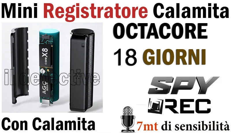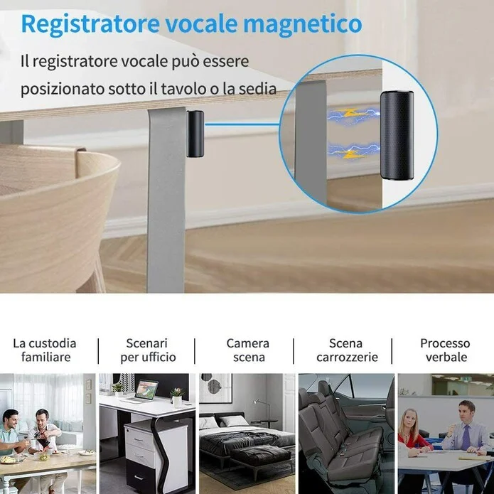 Registratore ambientale di nuova produzione, piccolissime dimensioni ma integra un processore suono di ultima generazione in grado di ridurre il disturbo amplificando la voce fino ad una distanza di 7 mt. Resistente all' umidità e con una potente calamita che permette di essere collocato anche in spazi esterni. Il registratore permette di lavorare in due modalità di registrazione, ovvero la registrazione continua, oppure la registrazione con attivazione vocale, la batteria interna da 3000 mha garantisce ben 18 giorni di autonomia, grazie al processore a bassissimo consumo di energia quindi riesce a mantenere ugualmente delle dimensioni ridottissime nonostante la sua grande autonomia. Un perfetto registratore spia per qualsiasi ambiente domestico oppure anche per l' auto inquanto grazie al magnete sarà semplice collocarlo ad esempio sotto il sedile o sotto il volante. Il circuito interno Samsung garantisce prestazioni senza eguali un microfono di alta qualità capta suoni e rumori a distanza restituendoci una registrazione sempre chiara e amplificata, la memoria interna da 16 gb garantisce più di 300 ore di registrazione.