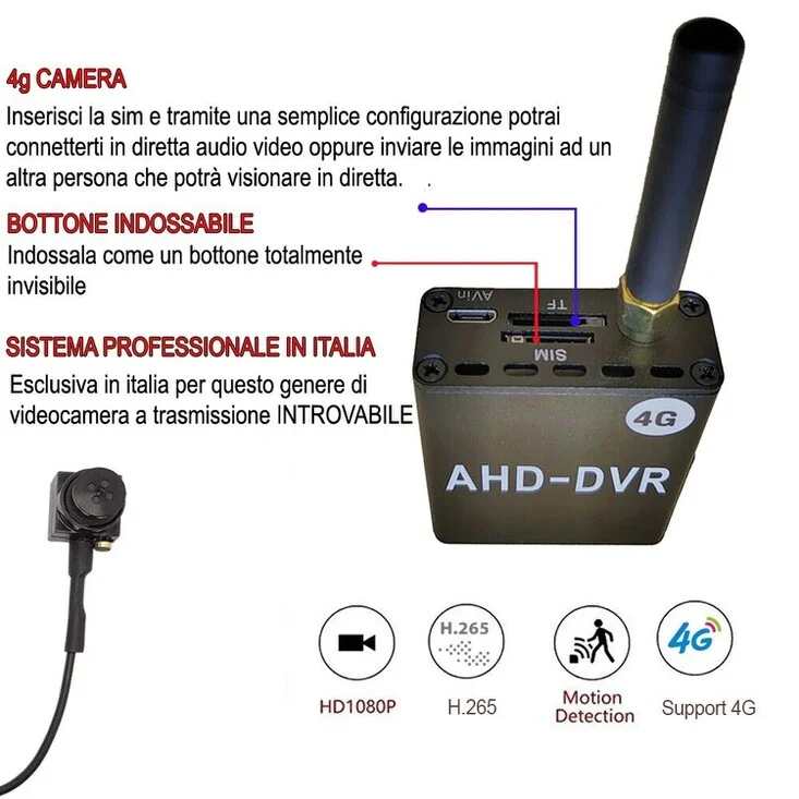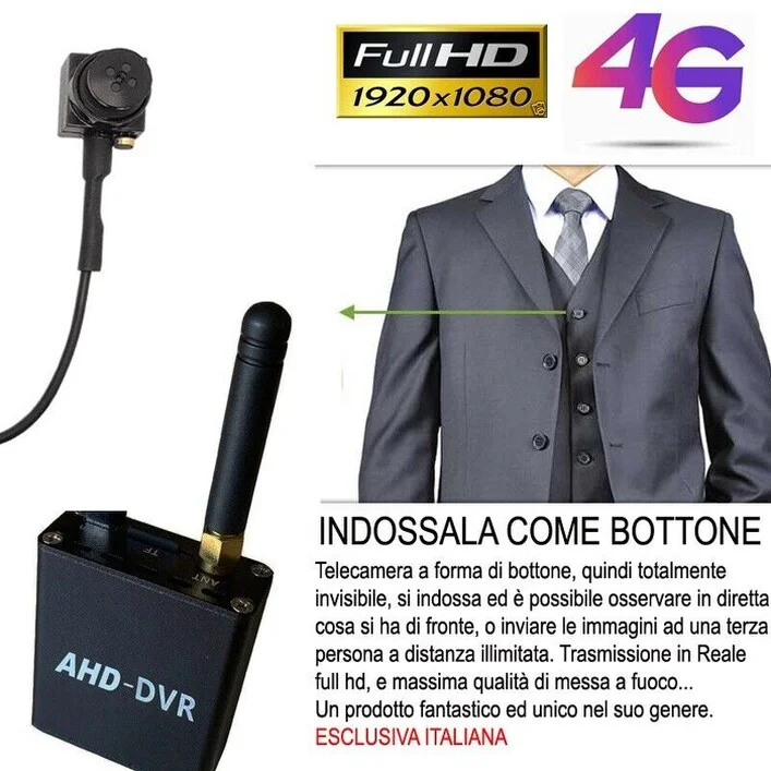 Micro telecamera a trasmissione AUDIO VIDEO in diretta con scheda SIM 4g, un dispositivo assolutamente raro e difficile da trovare un Italia, il dispositivo a forma di bottone permette di essere indossato come un vero bottone, il trasmettitore di appena 5cm è davvero piccolo, e viene occultato in modo semplice. Si inserisce una scheda sim al suo interno, l' importante è che la scheda abbia un pacchetto dati internet integrato, e attraverso esso, è possibile trasmettere in diretta a qualsiasi altra persona, oppure connettersi in diretta per visionare i propri ambienti, dove non vi è copertura wifi. E' dotato di una batteria interna che vi garantisce circa 4 ore di collegamento continuo e circa 10 ore di standbye ma supporta alimentazioni esterne.