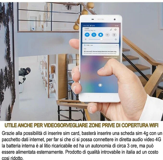 Nel caso necessitiate di una telecamera installare in un luogo dove non vi è installata una rete internet, la microcamera 4g è l' ideale, inquanto riuscirete a connettervi tramite la sua applicazione dedicata e quindi monitorare gli ambienti di proprietà quando assenti. Supporta micro sd espandibili fino a 128GB.