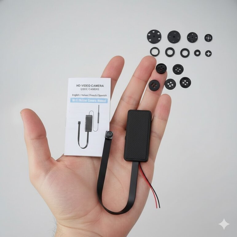 Microcamera a bottone Wi-Fi per lettura testi e monitor. Risoluzione Full HD con messa a fuoco ravvicinata nitida. Visione remota live e kit bottoni incluso.