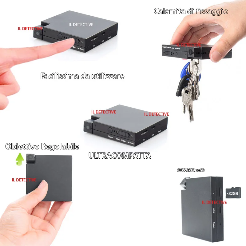 Posta sul retro della microcamera una potente calamita che permette di fissare in qualsiasi parte metallica il dispositivo, quindi insieme all' obiettivo rotante la rende molto pratica all' utilizzo ed al posizionamento in qualsiasi luogo