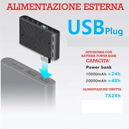 Supporta batterie POWER BANK, o corrente diretta. Risparmio incredibile delle registrazione video inquanto nonostante la massima qualità visiva con una batteria da 10.000 mha è in grado di registrare per ben 24 ore consecutive, invece con una 20.000 mha fino a 48 ore consecutive un record assoluto.