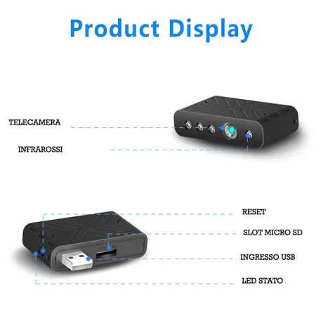 Esclusiva assoluta per questa fantastica micro telecamera spia, assolutamente introvabile online un prodotto con tali caratteristiche, rispetto a tutti gli altri modelli in commercio questa è l' unica micro telecamera spia alimentabile esternamente. La telecamera è di dimensioni ridottissime, misura solo 45mm e quindi facilmente installabile in qualsiasi luogo, Infrarossi potenti fino a 6 mt, possibilità di sovrascrittura opzionale, Sensore PIR di movimento. Il tutto gestibile tramite una semplice applicazione gratuita per ANDROID E IOS.