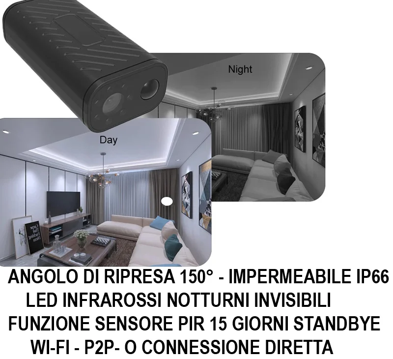 Nuovissima black box per la prima volta totalmente stagna e idonea per essere utilizzata in ambienti esterni, resistente all' acqua ed all' umidità. Dotata di un sensore PIR a led infrarossi potentissimi che offrono un' autonomia di efficienza incredibile, si parla di un massimo di 15 giorni con una sola ricarica. Il dispositivo unico nel suo genere, inquanto è ben risaputo che le microcamere spia Wifi hanno autonomia molto limitata in genere si parla di circa 6/8 ore, ma grazie al nuovo processore che nonostante la connessione Wifi ed in modo del tutto automatico, quando non vi sono movimenti entra in funzione un nuovo sensore che abilità la modalità smart Sleep che di norma è stato sempre utilizzato su altri dispositivi come i gps tracker ma grazie alle ultime innovazioni nel settore oggi è sfruttabile anche in questa fantastica microcamera che una volta ricaricata sarà possibile gestire il tutto comodamente da un app gratuita.
