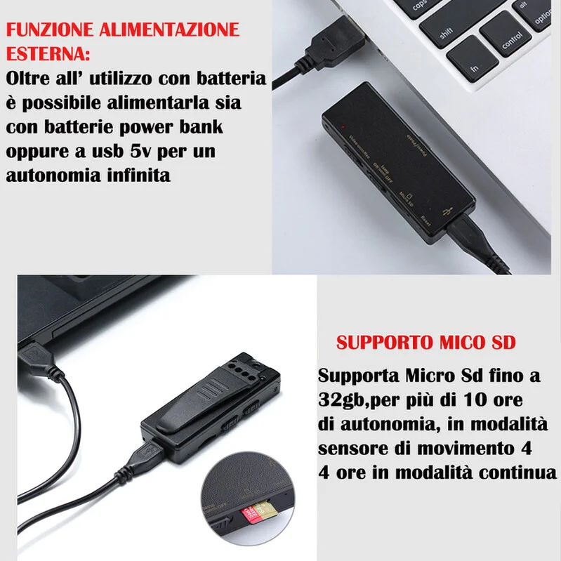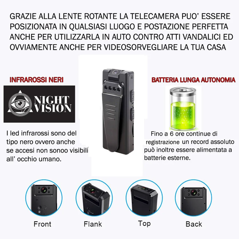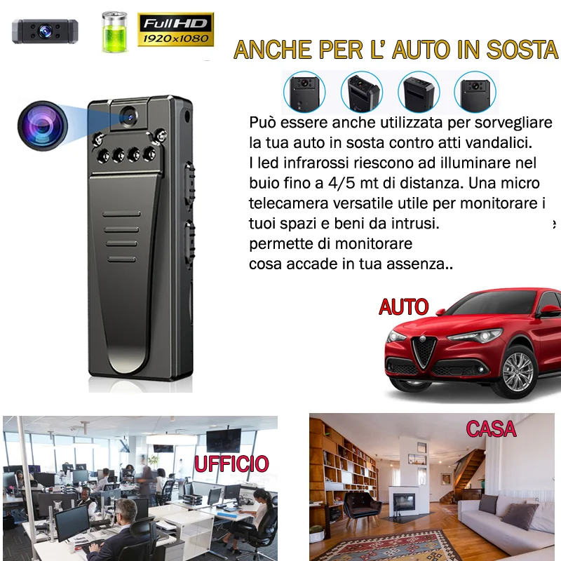 Eccezionale micro telecamera a visione notturna, con infrarossi potentissimi come poche telecamere miniaturizzate, il dispositivo di piccole dimensioni si nasconde con facilità in qualsiasi ambiente oppure oggetto, indicato anche per l' uso in autovetture per la sorveglianza notturna. La risoluzione video in HD reale offre immagini di altissima qualità sia di giorno che di notte, grazie al sensore pir ha uno standbye pari a 20 giorni prima che la batteria si scarichi, in caso di visione notturna può essere alimentata a corrente continua oppure con un classico power bank reperibile in qualsiasi negozio di elettronica al fine di poter ottenere una registrazione notturna fino a 20 ore di sorveglianza prima che la batteria possa scaricarsi.