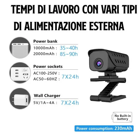 La più piccola telecamera spia esistente al mondo, in questa nuova versione finalmente anche a trasmissione video in diretta, difatti rispetto alla versione classica Dvr questa trasmette in diretta audio video le immagini a distanza. In questa versione è stata aggiunta una micro scheda di trasmissione wireless, e si connette in maniera nascosta al modem di casa, oppure sfrutta la connessione di un telefono posto entro un raggio di azione di 20 mt, trasmettendo a qualsiasi distanza le immagini e l' audio. La microcamera è progettata priva di batteria interna, in maniera tale da poter scegliere come alimentare la nostra telecamera al fine di ottenere più autonomia possibile, quindi o a batteria in dotazione da ben 20.000 mha che garantisce circa 25 ore di trasmissione, oppure ad alimentazione esterna a corrente 220v tramite adattore usb ( quello di un cellulare vabene).Grazie alla sua forma estetica la telecamera si nasconde in qualsiasi ambiente, fra l' altro la microcamera è dotata di dissipatore di calore, quindi la telecamera può lavorare per molte ore senza problemi.