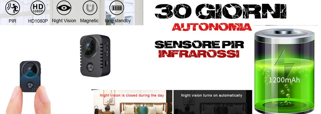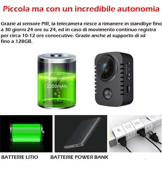 Ben 30 giorni di standbye e oltre 20 ore consecutive, grazie alla modalità sleep, ovvero quando nell' ambiente non vi è movimento il dispositivo si spegne, non consumando quindi la carica della batteria che difatto rimane intatta.