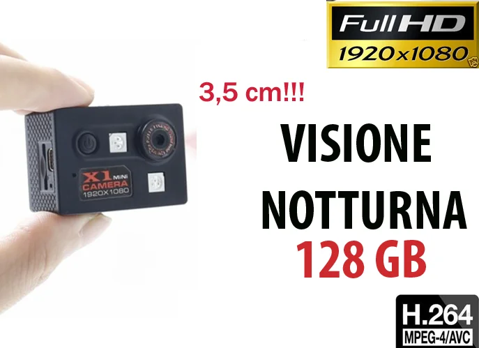 Piccolissima micro telecamera a visione notturna, di ultimissima generazione dotata di un sensore ottico prodoto in germania e due led infrarossi invisibili di nuova tecnologia assolutamente invisibile all' occhio umano, la microcamera è costruita con materiale di ottima qualità con una grandezza totale (compresa batteria) di soli 3,5 cm. La microcamera ha una risoluzione video in full hd 1080p ed offre delle immagini incredibilmente nitide, la batteria interna garantisce circa 70 minuti di autonomia, ma può essere alimentata con i classici power bank reperibili in qualsiasi negozio di elettronica per aumentare la batteria fino a 30 ore di autonomia. La telecamera registra in due modalità, registrazione continua e registrazione su sensore di movimento. Le registrazioni vengono memorizzate su sd card non compresa ( espandibile fino a 128gb) per registrare fino a 30 di filmati.