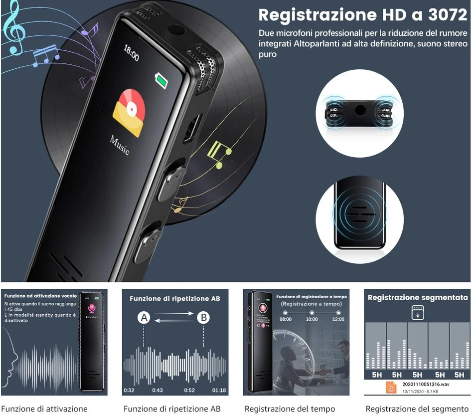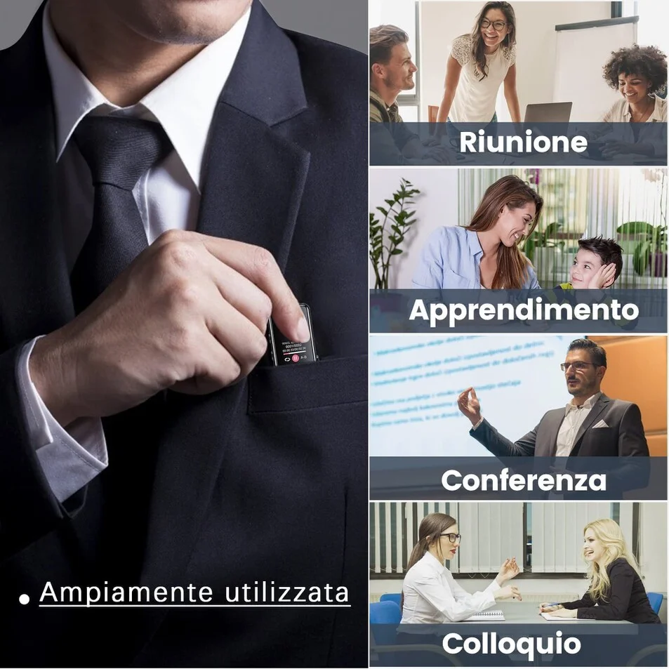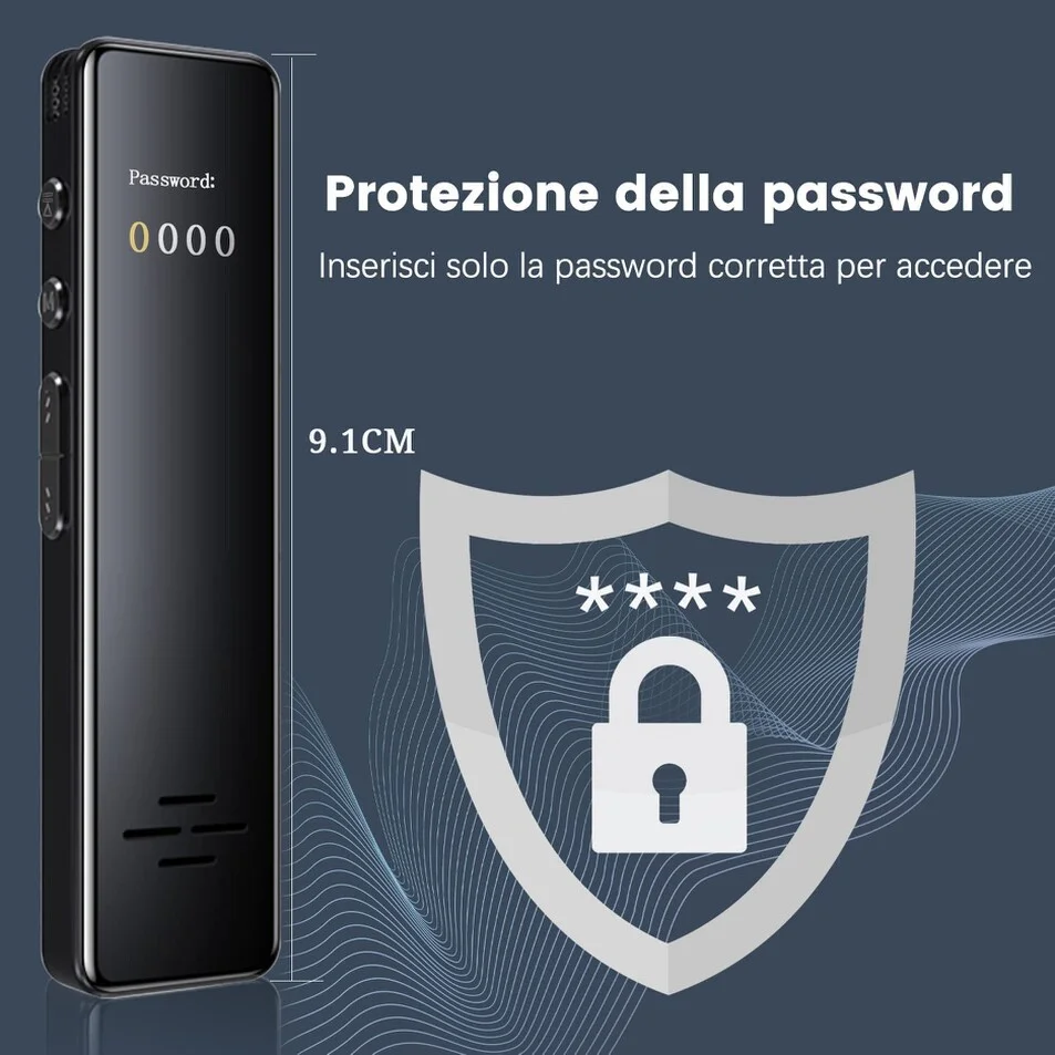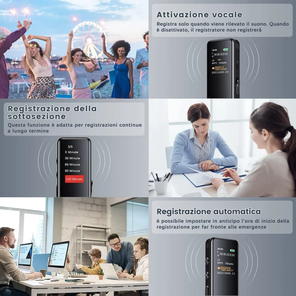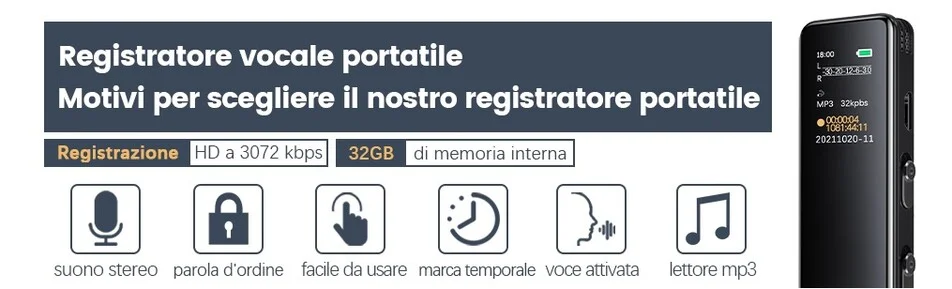 Registratore audio professionale, dotato di un comodo e luminoso schermo lcd a colori, che permette di impostare a proprio piacimento le impostazioni di registrazione del disposito. Il micro registratore audio professionale è indicato per registrazioni discrete, e adatto a qualsiasi attività come ad esempio per registrare una conversazione, una riunione, una lezione universitaria, oppure anche per registrare cosa accade in un determinato ambiente quando siete assenti. La batteria interna è ricaricabile ed offre un autonomia di circa 34 ore prima che esso possa scaricarsi, funziona anche connesso alla porta usb quindi in carica, la memoria interna da 32gb offre circa 300 ore di registrazioni audio, ed è possibile inoltre impostare una password per evitare che altri utenti non autorizzati possano accedere al contenuto del registratore. Il dispositivo di massima qualità è piccolo e discreto, nessun led durante la registrazione, viene nascosto facilmente, è inoltre ingrado di registrare anche dentro il taschino di una giacca grazia ai microfoni panoramici ultra sensibili, ed il processore di cui esso è dotato. Un altra funzione interessante è la possibilità di programmare una registrazione, ovvero è possibile impostare una data ed una determinata ora in cui il registratore dovrà iniziare la registrazione, ed in che tipo di modalità effettuarla se continua, oppure in modalità Attivazione vocale.