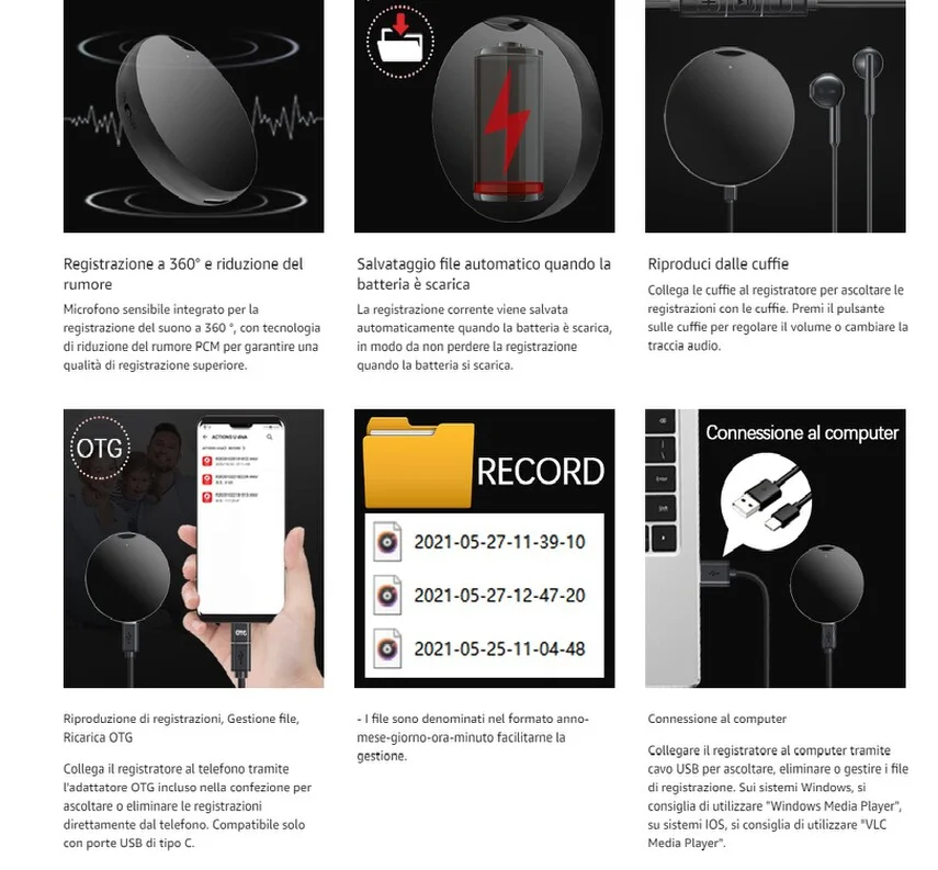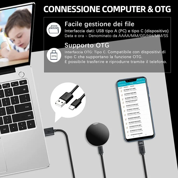 La massima comodità di connessione per l' ascolto, può essere normalmente connesso ad un pc e scaricare, salvare ed eliminare le registrazioni non necessarie, ma la particolarità è la possibilità di connessione tramite cavo OTG ( In dotazione nel kit) e quindi connetterlo a dispositivi USB tipo C, e quindi ascoltare direttamente dal vostro telefono e scaricare le registrazioni.