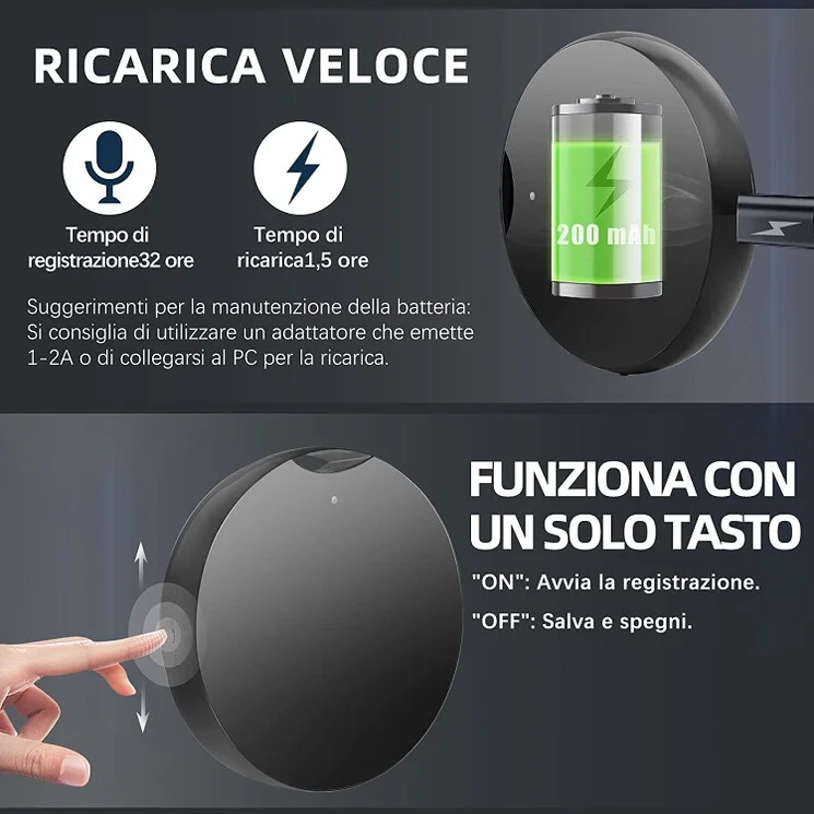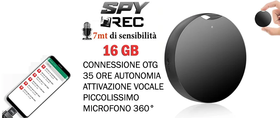 Micro registratore audio spia ultrapiatto, di ultimissima generazione, grazie a delle caratteristiche uniche che lo distinguono da tutti gli altri micro registratori. Memoria integrata da ben 16gb che garantiscono più di 300 ore di audio ad altissima qualità. Registra in modalità continua oppure in modalità Vox, ovvero che si attiva solo quando suoni e parole intorno ad esso lo fanno attivare. Il microfono rispetto alle altre versioni è un 360° quindi una registrazione molto sensibile e di qualità perfetta da ogni punto provenga l' audio percepito. 365 giorni di stato di stanbye un record assoluto per questo mini registratore e fino a 35 ore consecutive di registrazioni di qualità superlativa. Misura con Diametro 4cm e appena 1 cm di spessore.
