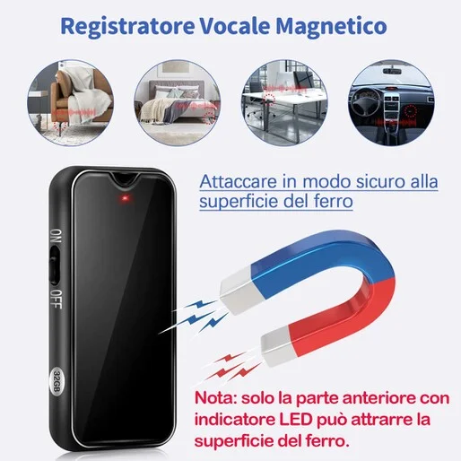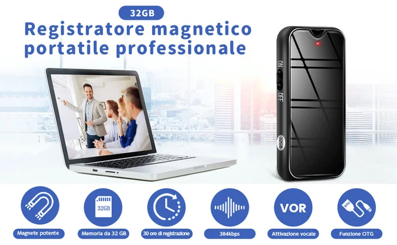 Fra i migliori registratori spia professionali in italia, un micro registratore che integra delle caratteristiche che lo rendono di qualità eccelsa rispetto a tanti alti prodotti. Il dispositivo di dimensionii ultraridotte ha un autonomia di ben 30 ore, sia in modalità continua sia in modalità Attivazione vocale. La memoria interna è integrata nel dispositivo, quindi un registratore completo e pronto all' uso, che offre uno spazio di archiviazione audio da 32gb. Sul retro è posta una potente calamita che permette di inistallarlo su superfici metalliche con la massima semplicità. La possibilità di connetterlo al vostro telefono tramite connessione OTG ( cavo incluso) lo rende eccezionale ed estremamente comodo, inquanto sarà possibile al bisogno scaricare le registrazioni o ascoltarle anche senza l' ausilio di un PC.