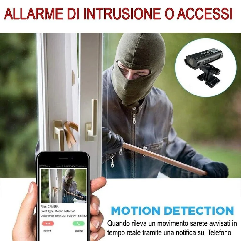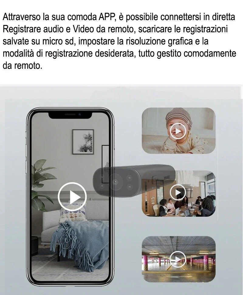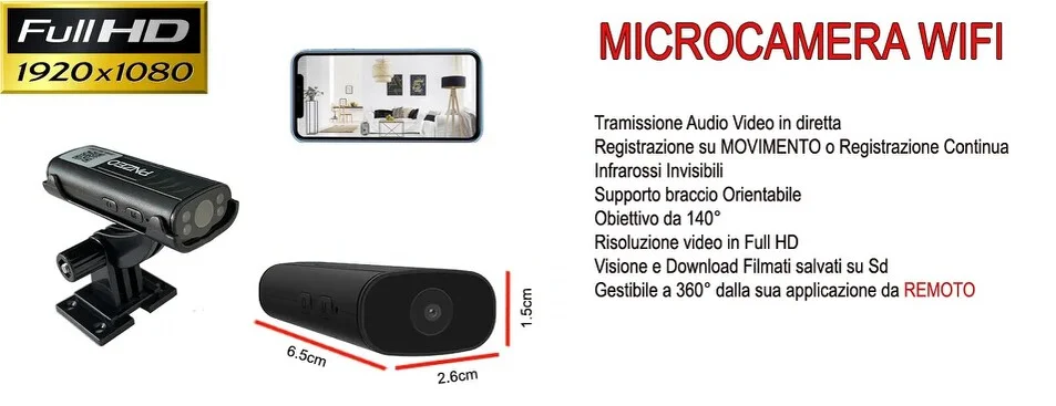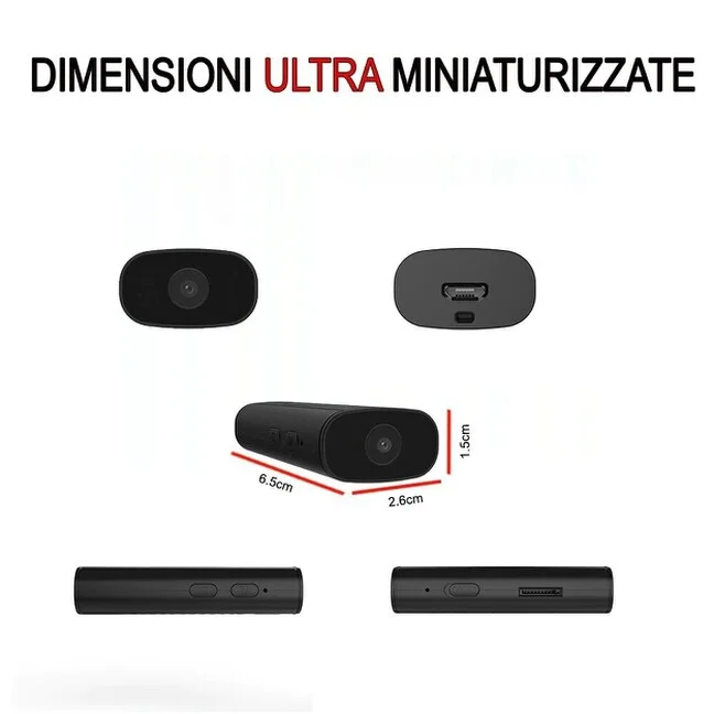 Fra le più piccole micro telecamere esistenti sul mercato, una telecamera che tramite una semplice configurazone permette di connettersi in diretta e osservare cosa accade in nostra assenza. La microcamera ha delle dimensioni davvero ridotte e quindi sarà facilissima da occultare in qualsiasi ambiente, o creare appunto la vostra telecamera nascosta personalizzata. Sul frontale accanto all' obiettivo con un grandangolo di ben 140° sono installati i led infrarossi che permettono di vedere in modo eccellente anche in condizioni di buio. I led infrarossi sono del tipo nero invisibile, quindi anche se accesi non sono visibili all' occhio umano. Supporta micro sd espandibili fino a 128gb per ottenere circa 15 giorni di registrazioni, può lavorare sia su rilevamento di movimento o su registrazione continua, o registrare in diretta durate la visione.