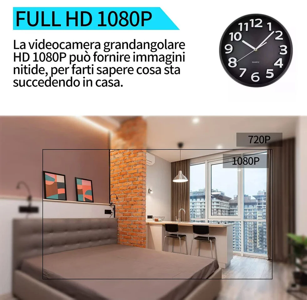 Bellissimo orologio da parete con micro telecamera installata al suo interno, totalmente invisibile, il dispositivo si presenta come un comune e bellissimo orologio nero da parete e come tale può essere installato in qualsiasi ambiente sia domestico sia lavorativo. Supporta la Visione da remoto tramite la scheda Wireless di cui esso è dotato e supporta micro sd fino a 128GB. La microcamera è alimentata da una propria batteria che offre circa 5 ore di trasmissione, in alternativa può essere anche alimentato a corrente continua per una funzionalità continua. Compatibile sia per dispositivi Android sia per dispositi IOS, l' app permette di gestire ogni singola funzione della microcamera, quindi scaricare le registrazioni effettuate, impostare la modalità di registrazione sia su continua o su sensore di movimento, registrare in diretta e tante altre funzionalità, semplicissimo da utilizzare uina microcamera totalmente insospettabile.