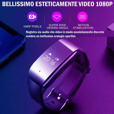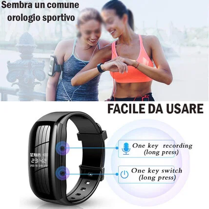 Sembra un comune orologio come potrete notare dalla foto, ed effettivamente il suo menù permette varie funzionalità per l' utilizzo sportivo, ma la videocamera perfettamente nascosta si avvia in maniera istantanea ed inizia la registrazione in meno di due secondi e grazie alla sua capacità di memoria interna di 16gb è in grado di immagazzinare circa 24 ore di riprese audio video.Il dispositivo è adatto per registrare in totale riservatezza senza esser notati, una riunione, una conversazione fra due persone, una registrazione contro atti persecutori e minacce, o registrare semplicemente una lezione in modo nascosto. La batteria è ricaricabile e si ricarica in sole 2 ore di collegamento a porta USB del pc, durante la ricarica è possibile anche salvare ed ascoltare le registrazioni effettuate.