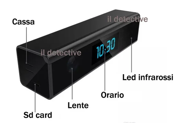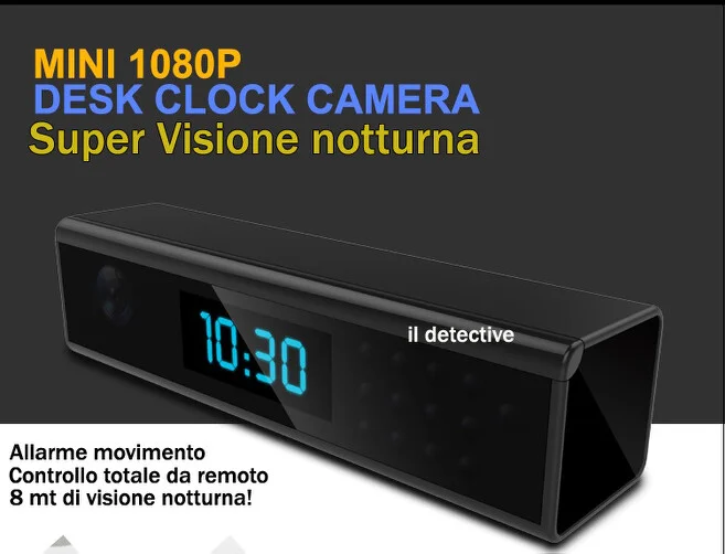 Bellissimo orologio digitale con telecamera nascosta a led infrarossi con una potentissima visione notturna fino a 8 mt di fronte ad essa, apparentemente si mostra come un normale orologio ma sotto il vetro oscurato vi è installata una micro telecamera in altissima definizione pari a 1920*1080. I led infrarossi sono del tipo invisibile quindi anche se accesi non sono visibili all' occhio umano. Permette inoltre la registrazione audio video direttamente su micro sd ( espandibile fino a 64gb) e garantisce più di 40 ore di registrazione audio video in sensore di movimento o registrazione continua. All' interno del dispositivo vi è installata una scheda Wi-Fi e tramite una semplice configurazione è possibile osservare a distanza da qualsiasi postazione e luogo vi troviate in diretta cosa accade durante la vostra assenza. L' orologio spia funziona alimentato a corrente continua quindi senza problemi di autonomia, e funziona come un vero kit da videosorveglianza, una volta installata nell' ambiente domestico o lavorativo oltre a poter osservare in diretta potrete attivare la funzione MOTION DETECTION ovvero la registrazione in presenza di movimento quando qualcuno accede alla stanza inviandovi fra l' altro un allarme direttamente sul vostro telefono in maniera tale da avvisarvi in diretta dell' intrusione o dell' accesso non autorizzato. L' orologio esteticamente bellissimo è un prodotto di alta qualità ed offre oltre ad un semplice utilizzo ampie garanzie di sorveglianza la telecamera è perfettamente nascosta e la sua forma estetica permette di collocarlo in bella vista senza doversi preoccupare che qualcuno possa notare la telecamera.