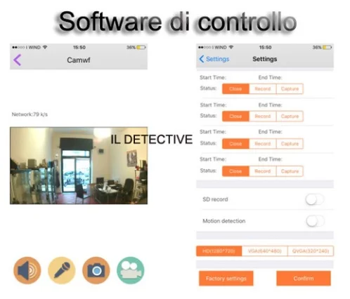 Il software offerto in questa microcamera è davvero eccellente sotto tutti i punti di vista, è possibile andare ad impostare qualsiasi parametro al fine di personalizzare le impostazioni al meglio in base al posizionamento, dalla luminosità d' immagine al contrasto, dalla sensibilità del sensore di movimento alla programmazione di registrazione ad una determinata ora, avviare interrompere la registrazione e scaricare le registrazioni effettuate, il tutto a portata di mano anche se siete distanti centinaia di km da casa.