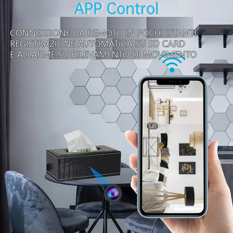 Come da immagine, l' oggetto è curato in ogni dettaglio, nulla che faccia pensare che vi sia una videocamera a trasmissione nell' oggetto. La micro telecamera è installata nello strato interno del box, e grazie ad un micro foro registra audio e video, il tutto gestibile da una comoda app disponibile sia per Android sia per Ios.Trasmissione audio video Wi-Fi P2P