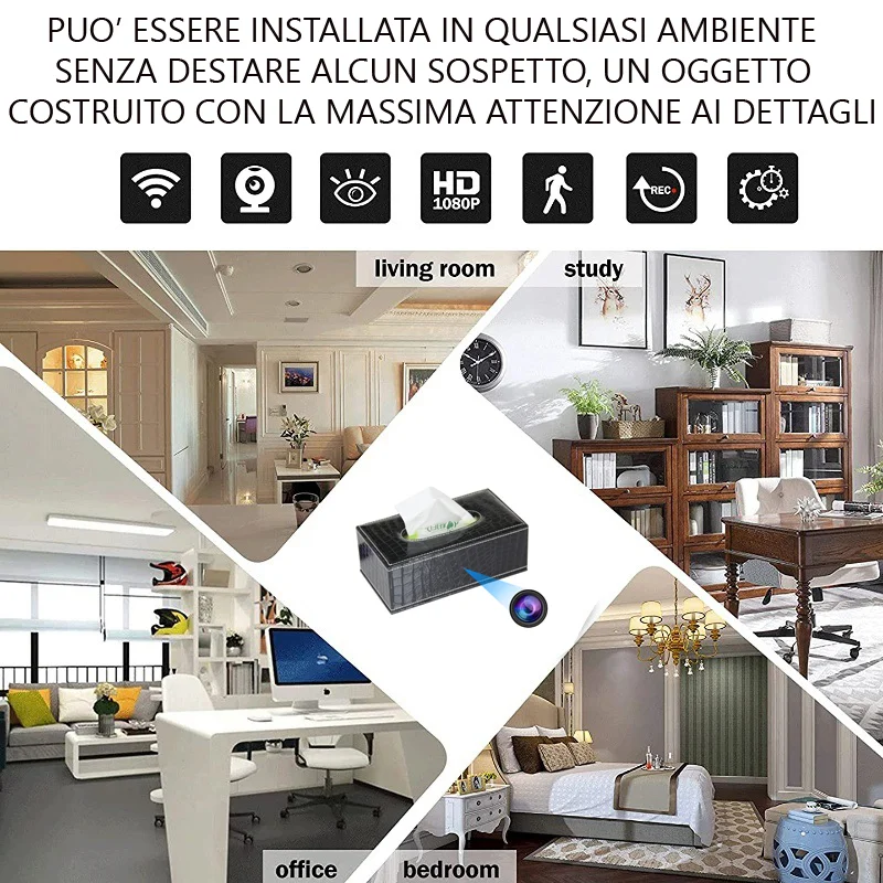 Telecamera nascosta in un classico porta fazzoletti, con finitura elegante che si adatta a qualsiasi ambiente sia domestico che lavorativo. La micro telecamera è nascosta ed è totalmente invisibile. Tramite una semplice configurazione è possibile connettersi a distanza e quindi videosorvegliare la zona in cui esso è installato, è dotato di una batteria interna con circa 7 ore di autonomia di trasmissione, quindi un prodotto che offre molte ore senza l' ausilio di batterie esterne ( funziona anche sotto alimentazione a corrente). La sua forma estetica lo rende un oggetto assolutamente insospettabile, mai nessuno potrà immaginare di cosa realmente si tratti. Oltre alla visione da remoto registra audio e video su micro sd ( non inclusa) espandibile fino a 128GB.
