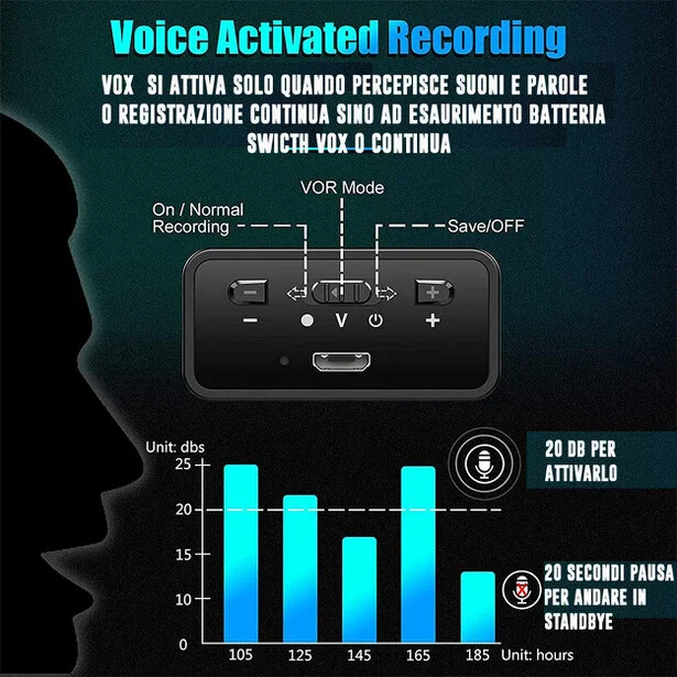 Grazie a questa modalità risparmierete notevole tempo per il riascolto, inquanto il dispositivo registrerà solo quando qualcuno parlerà dentro l' ambiente in cui esso si trova.