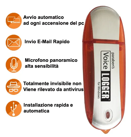 Novità assoluta per quanto riguarda i micro registratori spia, in questo caso un dispositivo ingegnoso e di altissima qualità totalmente gestibile dal software di cui è provvisto. Esteticamente ha l' aspetto di una normalissima chiavetta usb che si inserisce in una qualsiasi porta di un pc, e attraverso una facilissima configurazione il dispositivo inizierà a registrare in modalità Vox ovvero quando sentirà suoni e parole, e invierà attraverso email le registrazioni all' indirizzo che avremo scelto durante l' installazione.
