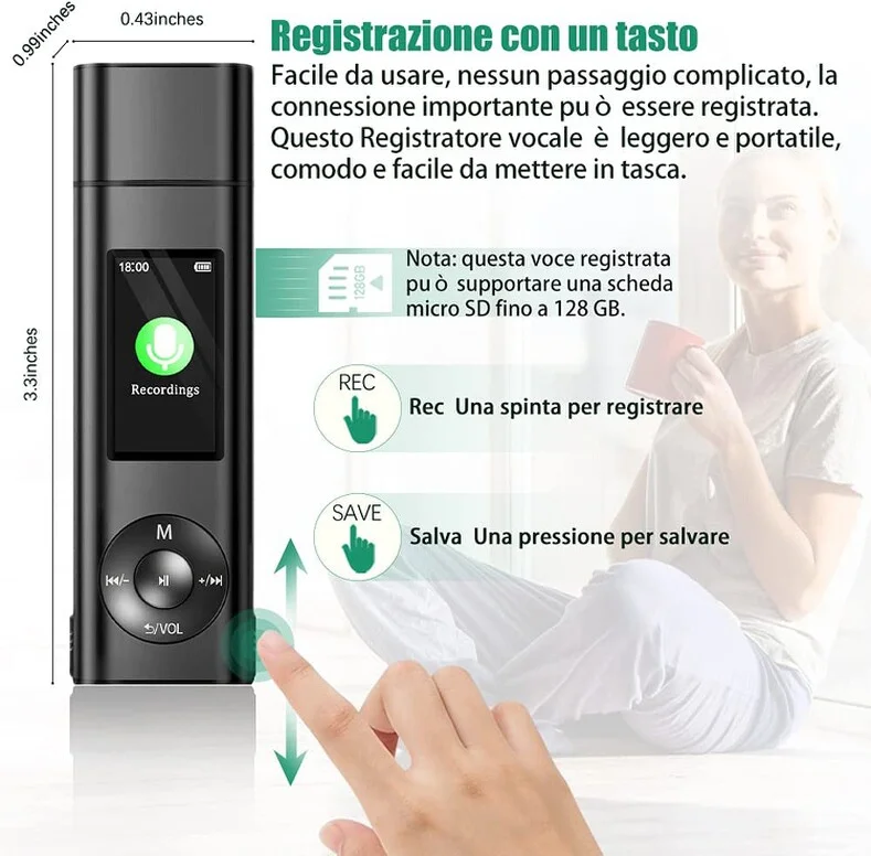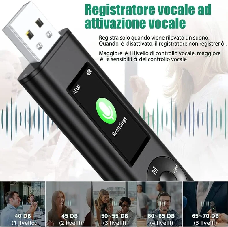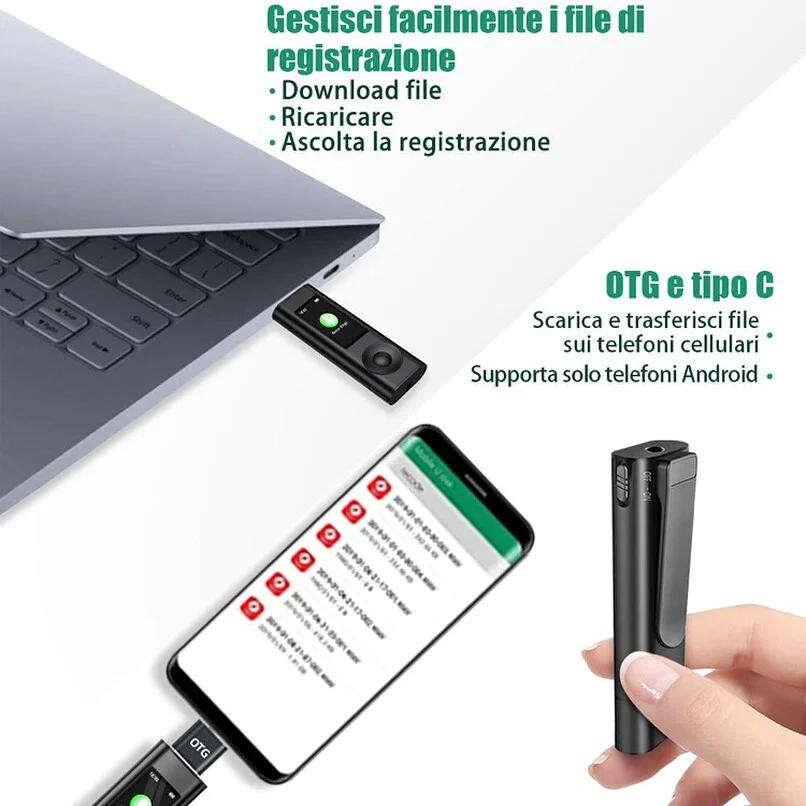 Mini Registratore audio digitale con comodo display per personalizzare al meglio le impostazioni di registrazione, un dispositivo piccolo e compatto ma con ampia capacità di registrazione grazie ai 16gb di memoria integrata di cui esso è dotato e soprattutto per la possibilità di inserire una password che proteggerà le registrazioni effettuate, quindi nel caso qualcuno dovesse entrare in possesso del micro recorder non potrà accedere al contenuto salvato su di esso. Il registratore di ultima generazione è dotato di un sensibilissimo microfono panoramico che riesce a registrare in modo chiaro fino a 7 metri di distanza dallo stesso, il processore interno quadcore mette in risalto suoni e parole e diminuisce i rumori di fondo, proprio per offrirci la massima qualità audio. Ben 35 ore di autonomia con una sola ricarica un record assoluto, e grazie alla funzione OTG permette il collegamento direttamente al vostro smartphone per scaricare e trasferire le registrazioni effettuate. Supporta inoltre l' inserimento di micro sd esterne fino a 128gb , e permette di registrare anche in carica per un autonomia di diverse settimane, un dispositivo eccezionale per qualsiasi situazione. Le registrazioni inoltre vengono memorizzate con Data e Ora della registrazione, aspetto fondamentale per sapere con certezza quando l' audio è stato registrato, anche sotto il punto di vista legale in caso di necessità di prove valide sotto il punto di vista legale.
