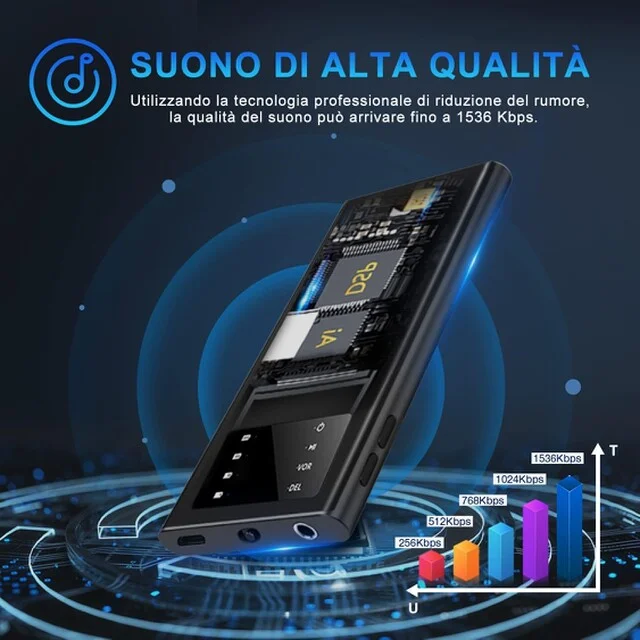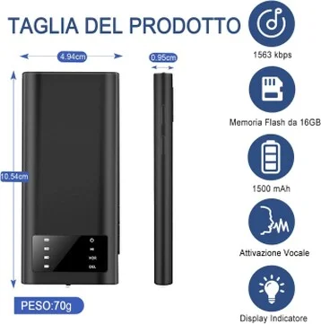 Registrazione su due diverse modalità di funzione, Registrazione continua e Registrazione ad attivazione vocale. Grazie alla funzione di Attivatore vocale, il registratore registra solo quando qualcuno parla entro un raggio di azion di circa 7mt, per tornare in modalità standbye quando il parlato termina. Questa modalità permette di risparmiare tempo per il riascolto, inquanto una volta connesso al PC, troverete solo le registrazioni di parlato, quindi risparmiando tempo per l' ascolto.