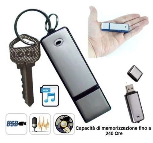 E' un microregistratore audio a forma di pen drive. Al suo interno è integrato un sensibilissimo e sofisticato microfono e un registratore in grado di effettuare 10 ore di registrazione audio in formato WAV. Il dispositivo è stato progettato per non essere identificabile: