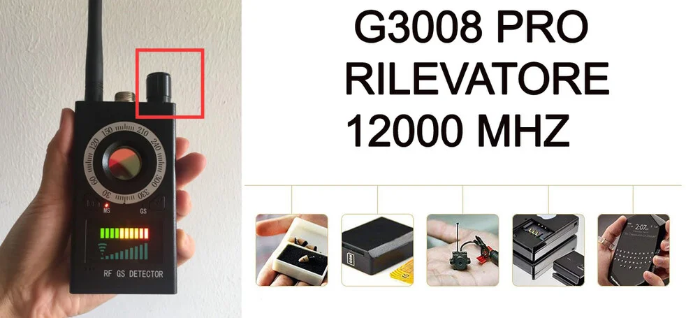 Un rilevatore per uso professionale, adatto anche a professionisti del settore, un dispositivo portatile e comodo, sempre pronto all' uso, la batteria interna è ricaricabile. Costruito interamente in metallo, già al tatto si mostra robusto e di alta qualità. Un dispositivo in grado di potervi offrire per la prima volta una bonifica ambientale davvero accurata e soprattutto completa, inquanto grazie al G3008PRO qualsiasi microspia potrà essere ritrovata con una facilità disarmante. Il suo funzionamento è semplice ed intuitivo, il dispositivo una volta messo in funzione analizza i segnali e man mano che ci avviciniamo alla fonte, inizia progessivamente ad illuminarsi, fino a portarti alla fonte del segnale, mentre attraverso la lente sarà possibile esaminare l' ambiente al fine di scovare microcamere nascoste. Le microspie rilevabili sono " MICRO AURICOLARI GSM, MICROSPIE GSM, TELECAMERE WIFI, TELECAMERE DVR, REGISTRATORI TELEFONICI, GPS TRACKER.