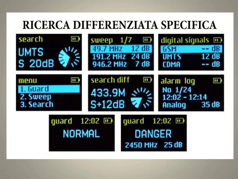 Il nostro rilevatore è prodotto in Russia, madre patria dei migliori dispositivi spia esistenti al mondo, il Detector permette di effettuare bonifiche con vari programmi, una generica, una per segnali Gsm, una per segnali UMTS oltre ai segnali WI-FI, segnali DIGITALI e ANALOGICI, ed ovviamente anche WIRELESS. Oltre a segnalarvi la fonte vi indica anche la provenienza del segnale, la potenza del segnale e la frequenza di lavoro della stessa.