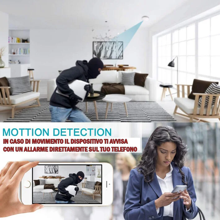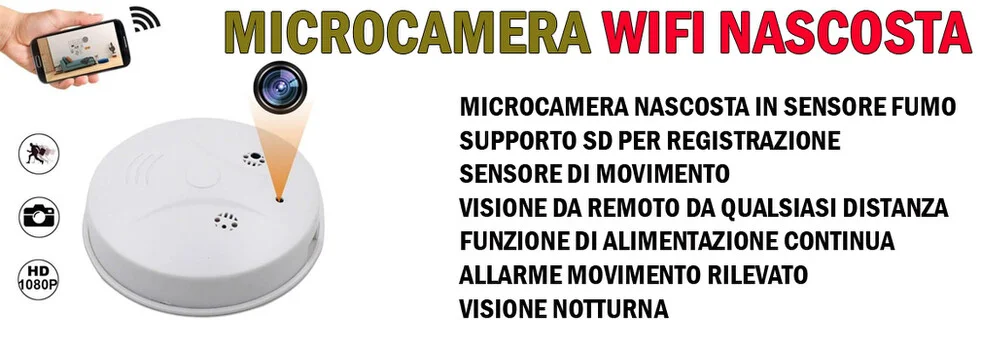 Telecamera nascosta insospettabile, un classico e normalissimo sensore di allarme fumo, che può essere installato in qualsiasi ambiente inquanto un oggetto di uso comune. Il dispositivo viene connesso direttamente a corrente 220V, e lavora alimentato ininterrottamente ciò significa che avrete una controlo 24 ore su 24. Al suo interno vi è installata una micro telecamera tel tipo PIN HOLE dietro un minuscolo foro ed un obiettivo di soli 0,5 mm tale caratteristica la rende totalmente invisibile. La sua installazione a parete o soffitto lo rendono totalmente insospettabile ed indistinguibile. Attraverso un' applicazione dedicata scaricabile sia per telefoni Android che IOS è possibile connettersi ricevendo in diretta Audio e Video anche se distanti centinaia di migliaia di km di distanza, il tutto a portata di telefono, inoltre supporta micro sd per la funzione di registrazione automatica, in modalità continuativa o in modalità sensore di movimento, quindi il MOTION DETECTION ALARM, che permetterà alla telecamera di registrare solo quando nell' ambiente circostante ci siano persone e animali.