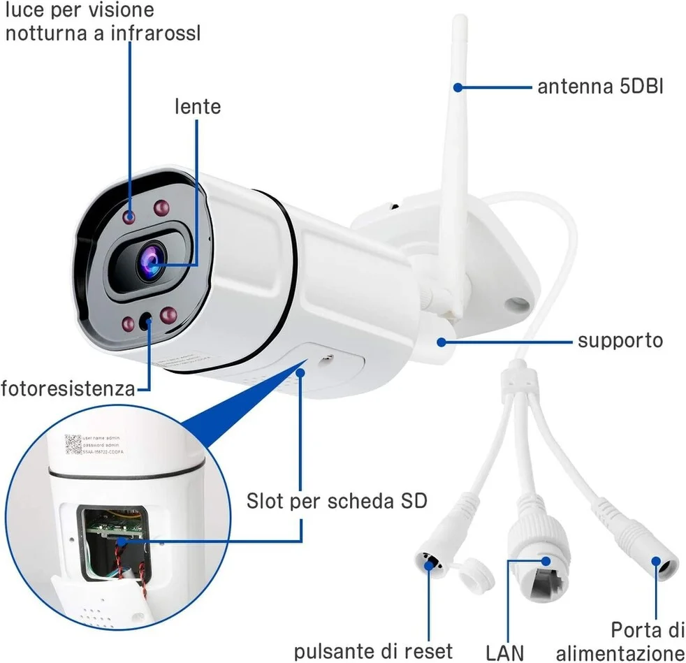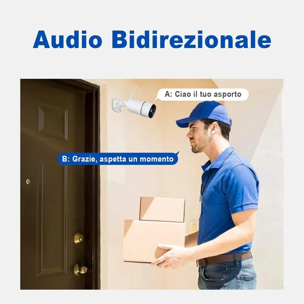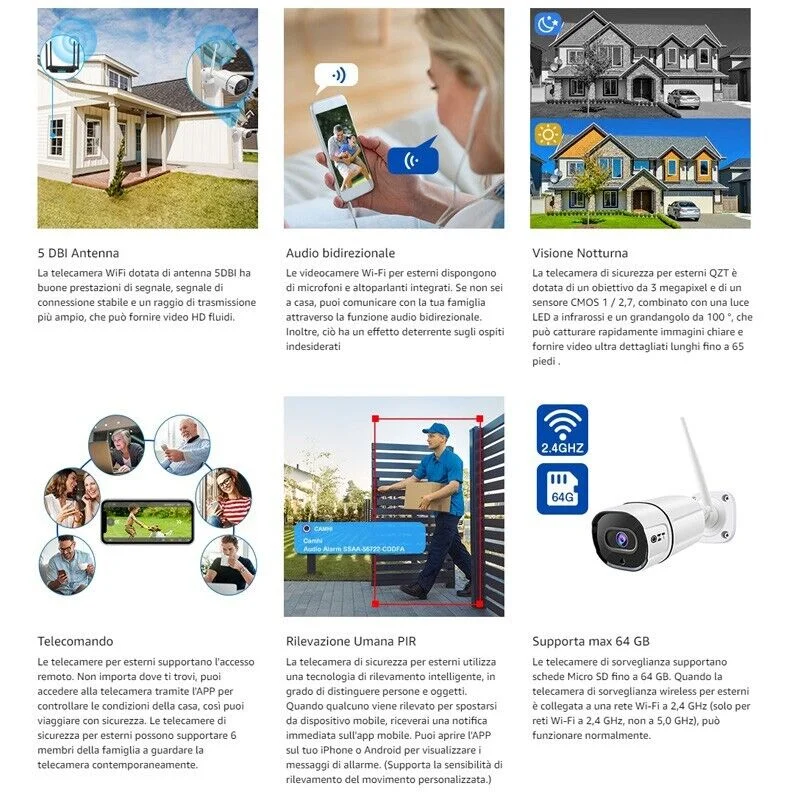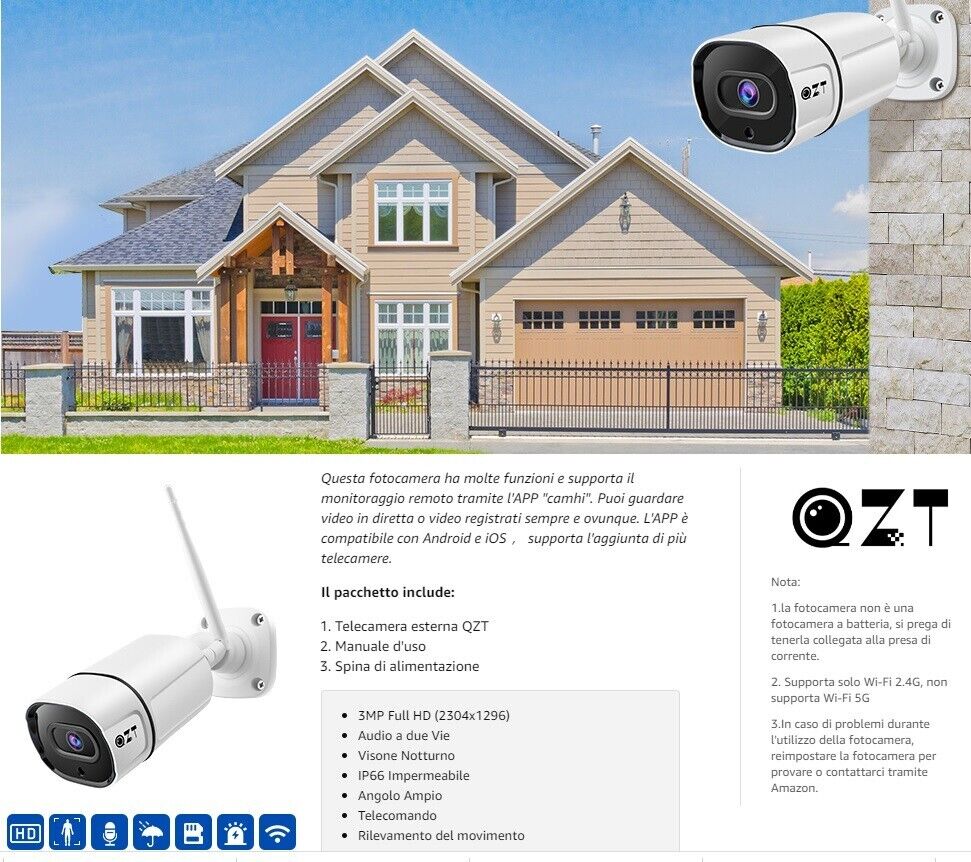 Telecamera ip wifi, senza fili di qualità eccelsa, con led infrarossi e sensore umanoide. La telecamera è la sorella minore della versione più grande sempre in vendita sul nostro sito, e garantisce standard qualitativi di assoluto livello grazie ad una lente installata in 2k ultra HD. La visione notturna nitida e potente fino a 25 mt nel buio totale, dotata di slot micro sd espandibile fino a 64gb che immagazzinano oltre 15 giorni di filmato, funzione di allarme movimento, registrazione continua o su rilevamento di intrusione ( movimento)invio email su allarme. Totalmente impermeabile resistente alle temperature più rigide, sia sotto zero gradi sia sopra i 40°, totalmente gestibile dalla sua applicazione gratuita, dalla quale è possibile avviare le registrazioni, impostare il sensore di movimento e allarme e scaricare le registrazioni effettuate sulla micro sd. Di semplice configurazione avrete una telecamera professionale e non un giocattolo costruite interamente in metallo ultrarobusto. Registra in full hd 2k 3mpx, qualità visiva nitida sia di giorno che di notte. l' obiettivo quadrangolare ha un angolo di ripresa da ben 160°.