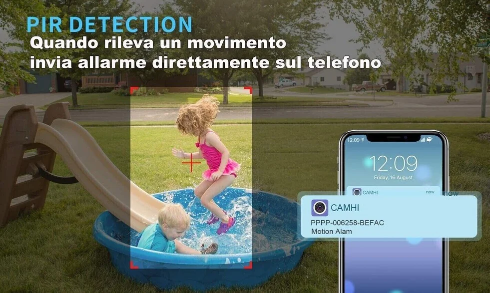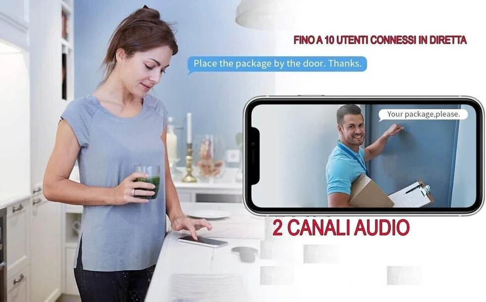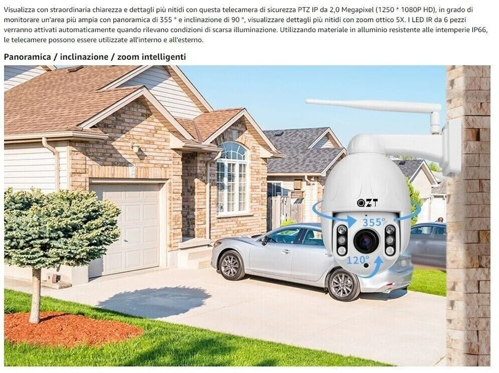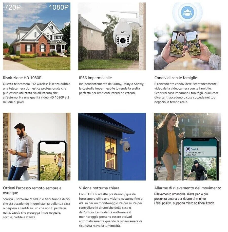 Telecamera ip wifi, con tramissione audio video in diretta, semplicissima da utilizzare e assolutamente eccellente per le qualita' prestazionali, con registrazione manuale su comando direttamente dal vostro smartphone, oppure in automatico grazie al sensore di movimento integrato. La telecamera si connette alla linea adsl di un qualsiasi luogo e tramite la connessione internet riesce a inviarvi in diretta audio video immagini in hd con risoluzione full hd 1920*1080p con immagini nitide e colori brillanti.Totalmente impermeabili possono essere installate esternamente con la possibilita' di inserire sd card fino a 128gb ciò permette di avere una registrazione di circa 22 giorni prima che la stessa inizi a sovrascrivere i file più vecchi. Gli infrarossi potenti offrono un'eccellente visione notturna, e grazie al sensore di movimento registrano solo quando rilevano un movimento di fronte alla stessa entro 40-50 mt. Totalmente innovative rispetto alle telecamere classiche inquanto ogni telecamera è un vero e proprio dvr a se, quindi niente cavi kilometrici per casa o nel vostro ufficio, basterà solo inserire il cavo di alimentazione all' alimentatore già incluso e registrarla nella loro applicazione gratuita, per avere un kit da videosorveglianza diretta 24 ore su 24, nell' applicazioneè possibile registrare moltissime telecamere circa 20, ciò permette di avere con una sola app, il controllo remoto di tutte le telecamere installate. Grazie al motore è possibile ruotare la telecamere con 355° per un controllo totale da remoto. Questa telecamera è una camera professionale ad un prezzo eccellente viste le sue prestazoni tecniche di primo livello per esterni, con impermeabilizzazione ip66 e con dissipatore di calore ed inoltre ingrado di lavorare anche sotto i 40 gradi. La miglior telecamera da esterno, qualita' delle immagini cristallina! grazie ai ben 2 mp dell' obiettivo, e grazie al motore e' possibile direzionare e osservare qualsiasi angolo e zona di vostro interesse, rispetto alle vecchie versioni che erano ingombranti e orribili da vedere il suo design è elegante e curato in ogni minimo particolare, insomma oltre ad essere una telecamera da videosorveglianza " PROFESSIONALE" è anche bella da vedere. Indicata anche per coloro che parcheggiano l auto sotto casa con questa fantastica telecamera grazie ai led infrarossi ultrapotenti che riescono ad illuminare fino a 40-50 mt la vostra auto sara' al sicuro contro atti vandalici. La telecamera ha un gradangolo di ripresa da 160°. Dotata di zoom ottico 5x che permette di avvicinare l' immagine con una qualità eccezionale, ed il sensore HUMAN SENSOR, che rileva il movimento solo in caso di esseri umani, e non movimenti ambientali. Microfono integrato e audio a 2 vie, è possibile comunicare anche attraverso la telecamera da qualsiasi distanza.