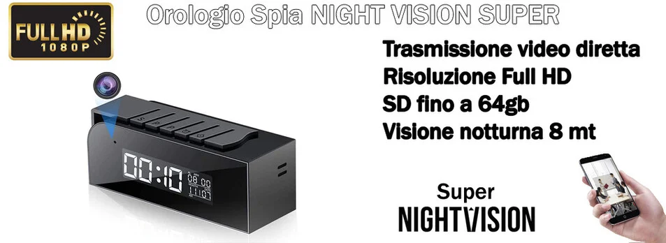 Bellissima e nuovissima sveglia orologio con telecamera nascosta al suo interno e potenti led infrarossi per una visione notturna con led invisibili ultra potenti. La telecamera è assolutamente invisibile, a vederla mostra solo ed esclusivamente l' ora e la data e nulla lascia intendere che all' interno vi sia installata una telecamera che permette di collegarsi a distanza in modo discreto, e osservare ed ascoltare senza destare sospetto. Grazie ad una semplice configurazione l' orologio permette il collegamento da remoto e permette anche di effettuare registrazioni sia in modalità automatica sia su modalità sensore di movimento.