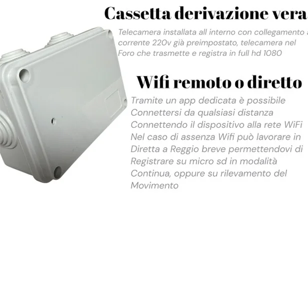 Cassetta di derivazione con telecamera nascosta Wifi che permette una trasmissione audio video continua grazie all' alimentazione continua in dotazione. La microcamera è nascosta al suo interno tramite un piccolo foro, quindi parliamo di una telecamera PIN HOLE, con una ripresa quadrangolare di 120° un dispositivo di sorveglianza insospettabile. Supporto micro sd espandibile fino a 32gb che permette di immagazzinare circa 40 ore di filmati. Basta una semplice configurazione per far si che il dispositivo trasmetta audio e video da qualsiasi distanza.