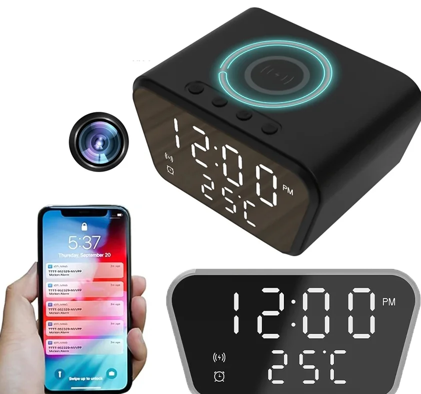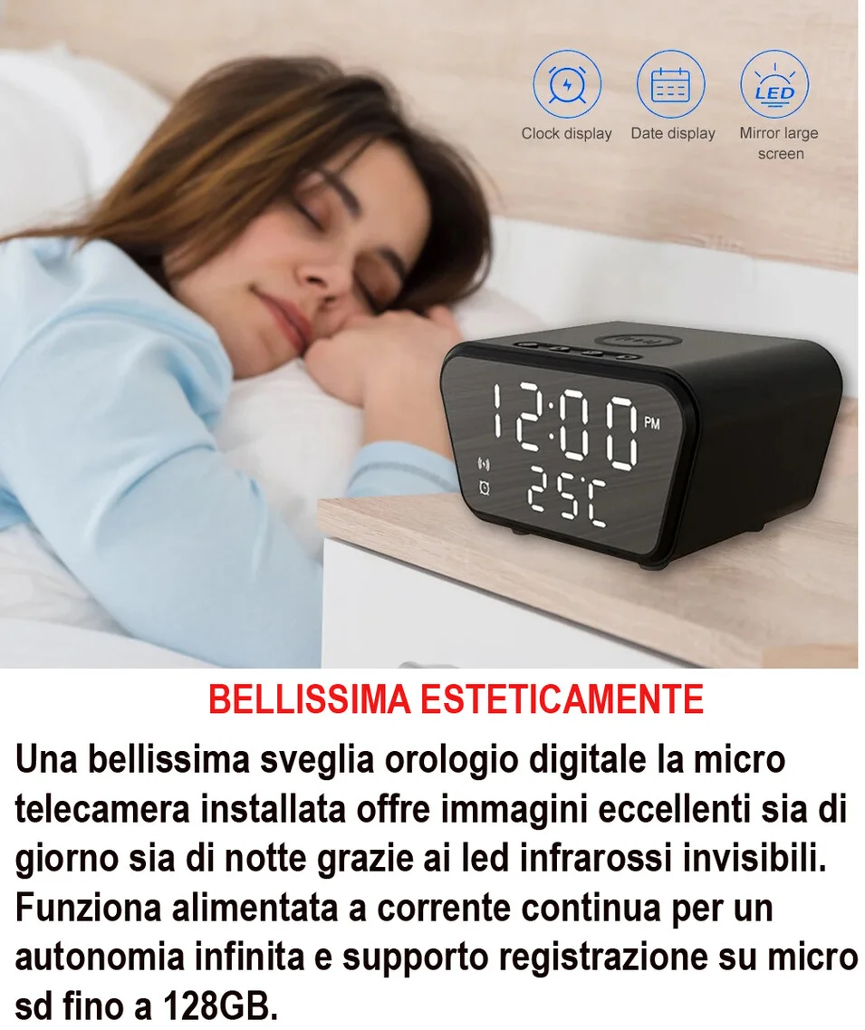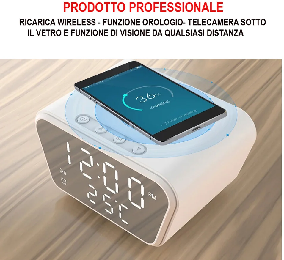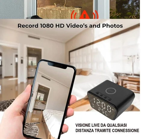 Bellissimo ed insospettabile orologio digitale con micro telecamera nascosta installata al suo interno. Esteticamente perfetta la telecamera è totalmente invisibile anche se guardata da vicino, sembra una comune sveglia orologio con funzione di ricarica wireless e temperatura. Integra una microcamera nascosta dietro il vetro che permette oltre la registrazione il controllo da remoto tramite applicazione e tutte le funzioni di registrazione e di notifiche di movimento rilevato quando assenti. Supporta micro sd fino a 128GB e può essere alimentata a corrente continua per una funzionalità 24 ore su 24. Risoluzione video ultra HD 1080P con obiettivo da 3 mpx.