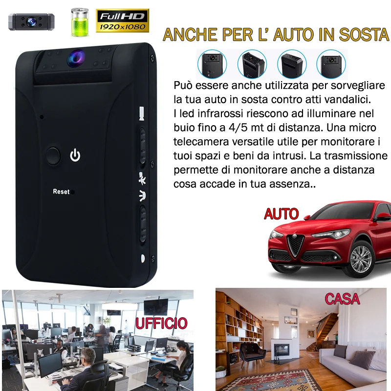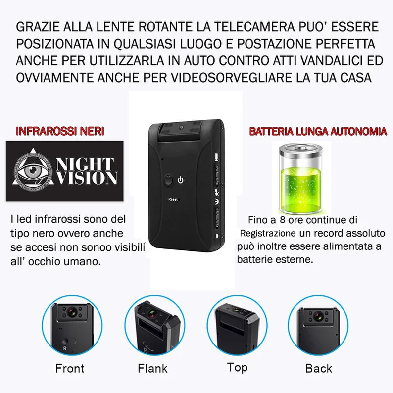 Piccola Black box perfetta per monitorare i tuoi ambienti ed anche la tua telecamera in sosta, anche di notte grazie ai led infrarossi di cui la micro telecamera antivandalismo è dotata. Registrazione su Sensore di Movimento oppure su Registrazione continua, offre ben 8 ore di autonomia con una ricarica e l' obiettivo è rotante di 180° quindi permette di inclinarla nella posizione perfetta andando a puntare un determinato punto, oppure se utilizzata in auto una fiancata intera o il cofano, in base a cosa vorrete monitorare. La telecamera è dotata di led infrarossi per la visione notturna quindi di notte registra anche in assenza di luce, i led sono neri e quindi invisibili all' occhio umano e se accesi non sono visibili.