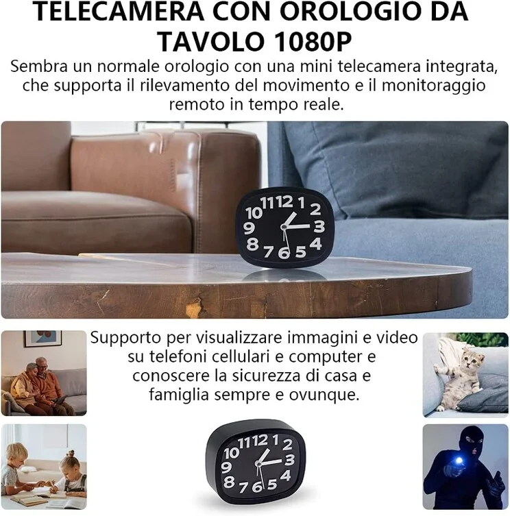 Orologio da tavolo a lancette, una forma classica ed insospettabile, integra una micro telecamera ad alta definizione impossibile da individuare. Il dispositivo offre la possibilità di connessione da remoto tramite la scheda wifi di cui essa è dotata. Tramite una semplice configurazione il dispositivo sarà accessibile da remoto 24 ore 24 e 365 giorni all' anno se alimentato a corrente continua, oppure in alternativa è possibile utilizzarlo a batteria integrata che offre circa 4 ore di trasmissione. La risoluzione video è un reale full HD, quindi massima qualità di immagine, e supporta la registrazione sia su modalità continuativa, sia su modalità sensore di movimento. Supporta micro sd fino a 128gb per ottenere più di 20 giorni di registrazioni. Vista la sua forma estetica può essere lasciato in bella mostra nulla che faccia sospettare che si tratti di una micro telecamera l' oggetto è progettato in maniera minuziosa, una telecamera spia professionale di altissima qualità che trasmette in diretta audio e video da qualsiasi distanza vi troviate.