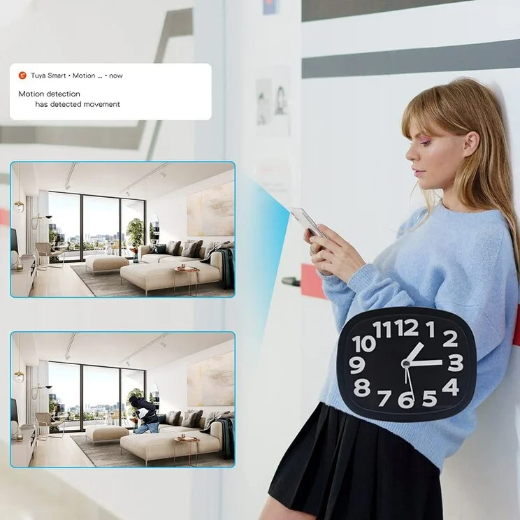 Tramite l' applicazione per telefoni ANDROID E IOS, è possibile personalizzare le impostazioni della telecamera, quindi possibilità di settare la sensibilità del sensore di movimento, la modalità di registrazione, ed anche la funzione allarme, ovvero se desiderato, ogni qualvolta qualcuno effettua l' accesso nell' ambiente in cui è posizionato l' orologio, in maniera automatica il dispositivo inizia a registrare audio e video, ed inoltre invia una notifica di allarme direttamente sul telefono, avvisandovi in diretta dell' accesso. Quindi un sistema di controllo e sicurezza completo.