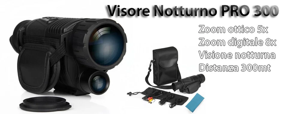 Il visore notturno 300pro è progettato con materiali di altissima qualità, ma la caratteristica fondamentale è la sua portabilità, basta un semplice click per accenderlo, una volta impostato ad una determinata distanza anche se il dispositivo viene spento conserva le impostazioni. Tramite il software in dotazione è possibile effettuare tutte le regolazioni al fine di ottenere la massima visibilità anche se notevolmente distanti. Un prodotto professionale da non confondere con i prodotti reperibili in italia che hanno un prezzo relativamente basso e poi ci si ritrova con prodotti di bassissima qualità e totalmente inutili. Il display interno è ampio, e totalmente intuitivo, la messa a fuoco avviene sia tramite le impostazioni del software e tramite le due lenti poste nell' obiettivo frontale e nella lente che va a contatto con l' occhio.